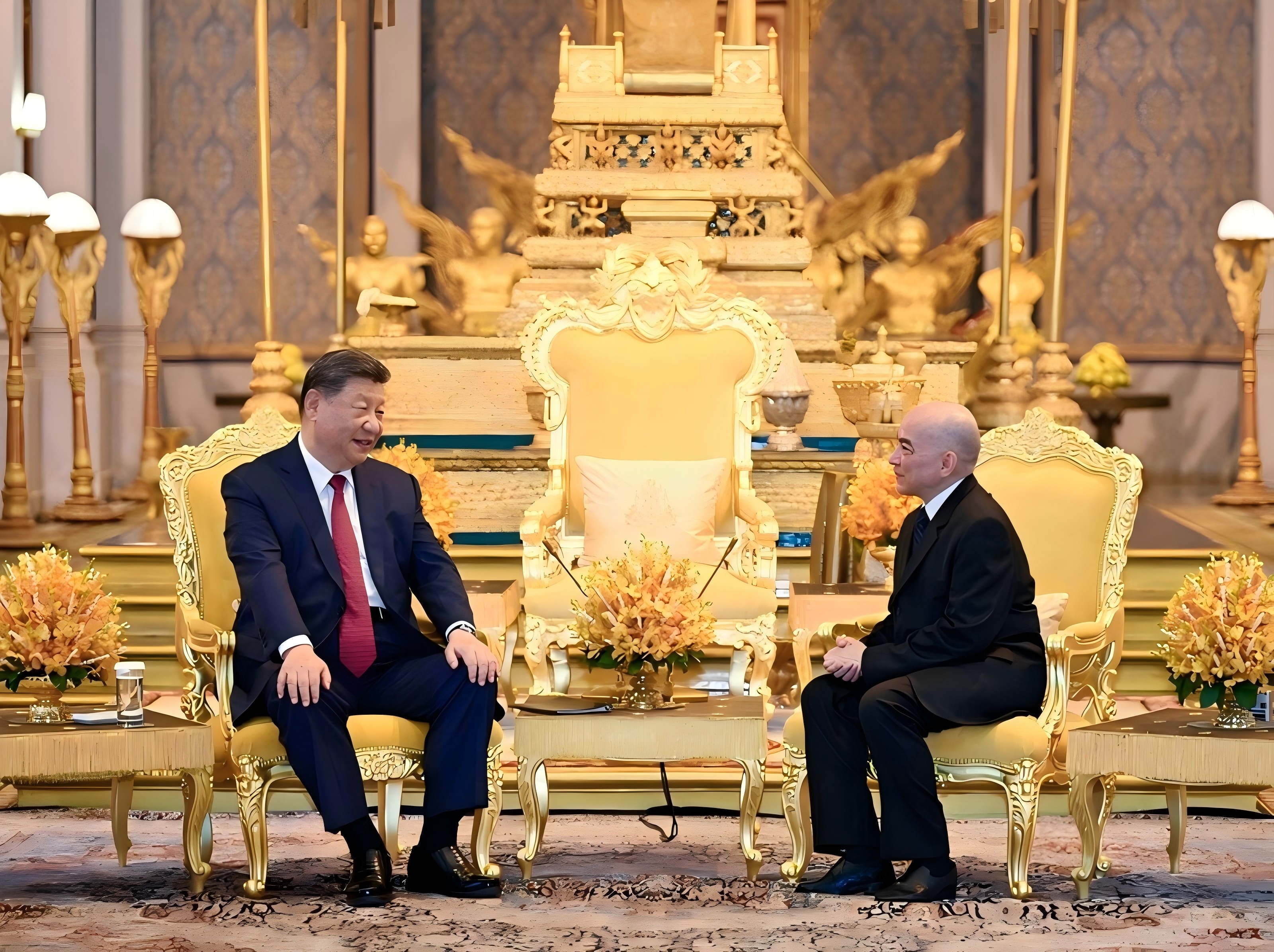 4月17日下午,柬埔寨国王西哈莫尼同中国国家主席习近平在金边王宫举行会见。这是会见后,两国元首步出金边王宫。新华社记者 殷博古 摄